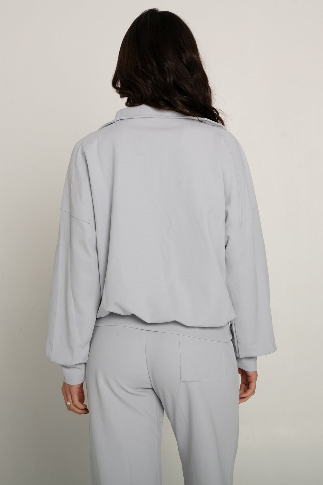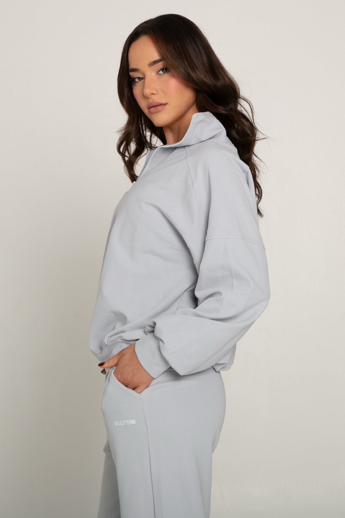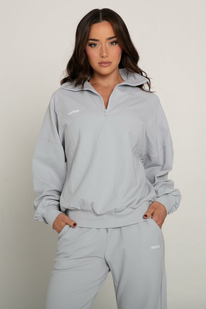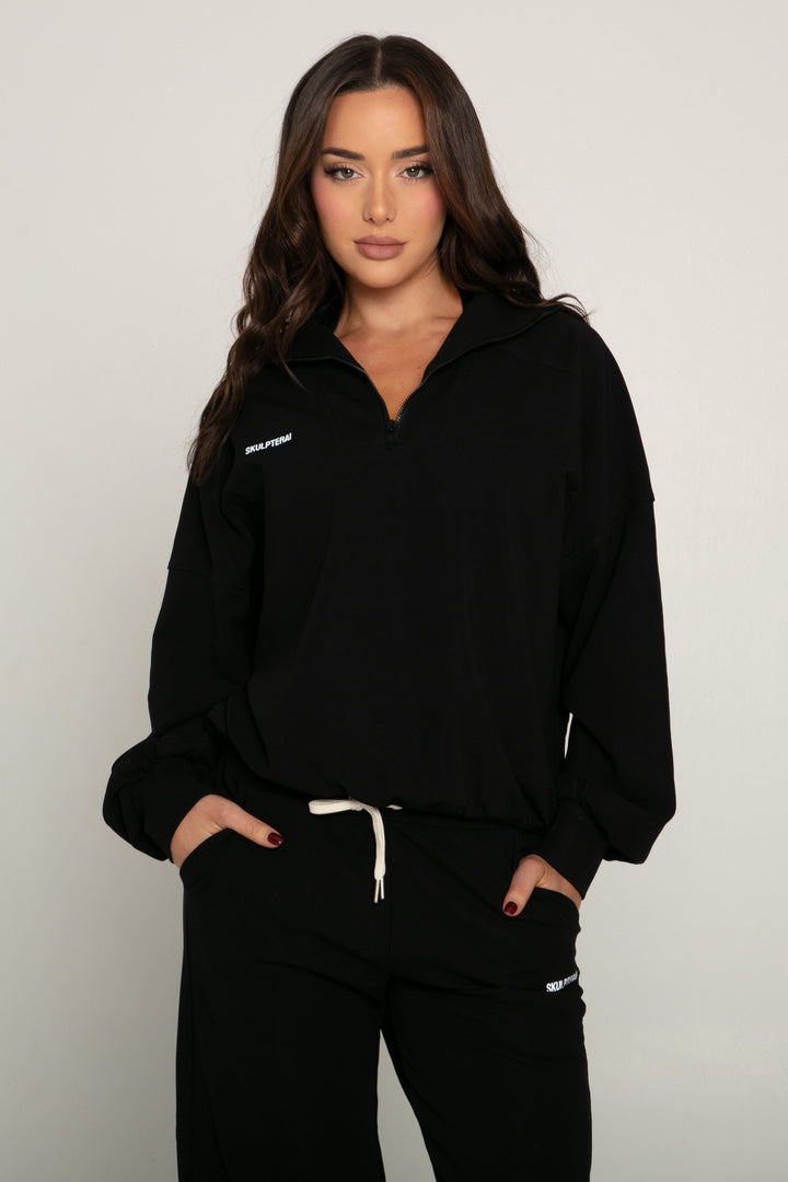 Designed to pair with our Sunday Wide Leg Trackpant, this oversized quarter zip sweater is your go-to for off-duty days. Made from a soft cotton-poly-spandex blend, it features a relaxed drop-shoulder fit, high zip collar, and ribbed cuffs for structure and warmth.
